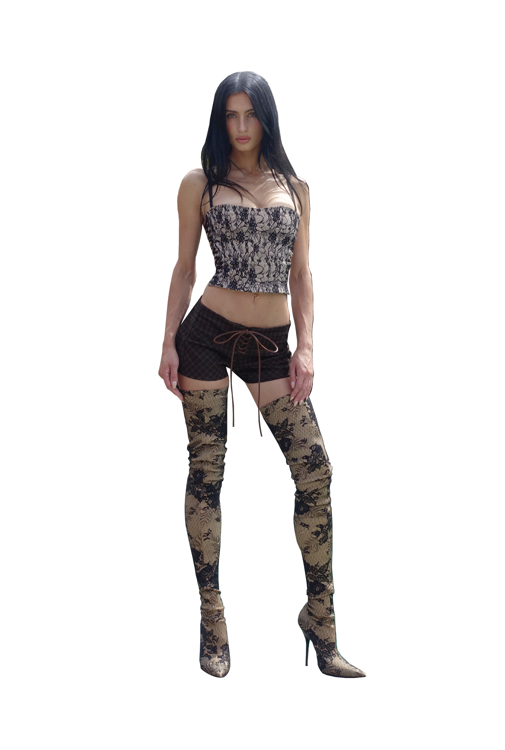 The Cowboy Mini Shorts—a low-rise, tiny sensation crafted from a flexible Ponte Knit that strikes the perfect balance between comfort and style. These shorts provide just the right amount of stretch for ease, coupled with the ideal thickness to effortlessly elevate your look, whether you're dressing up or down. The fabric showcases a charming brown check design, and the shorts boast curved design lines along with a front eyelet lace-up detail. Stay comfortable and chic with the Cowboy Mini Shorts, your versatile choice for any occasion.