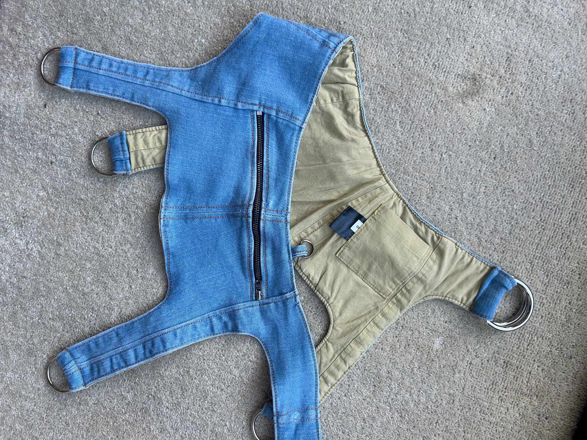 - two large zipper pockets, hidden patch pocket, ring for keys