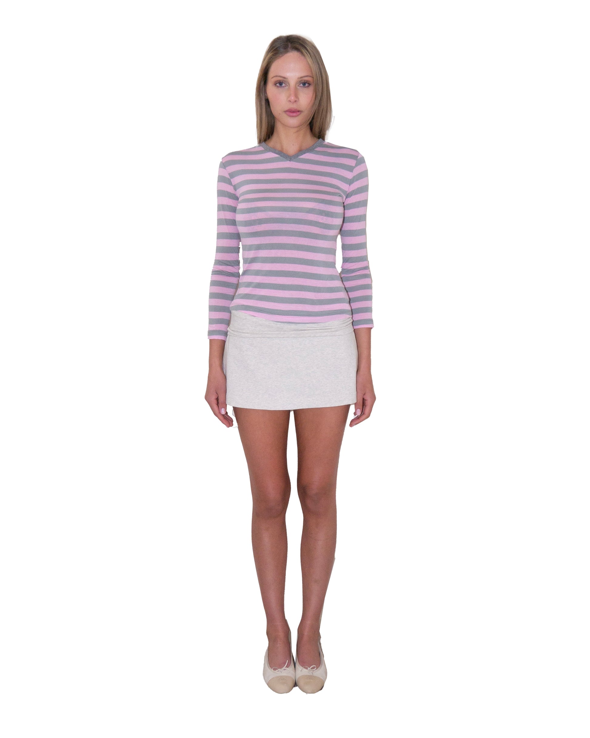 A relaxed v-neck long sleeve with a flatter-ing edge. Made from soft poly-cotton and finished with a contrast grey ribbed neck- line, this long sleeve top is designed to sit slightly away from the body while still creating a clean, shaped silhouette. Finished with a rubber OR logo detail.