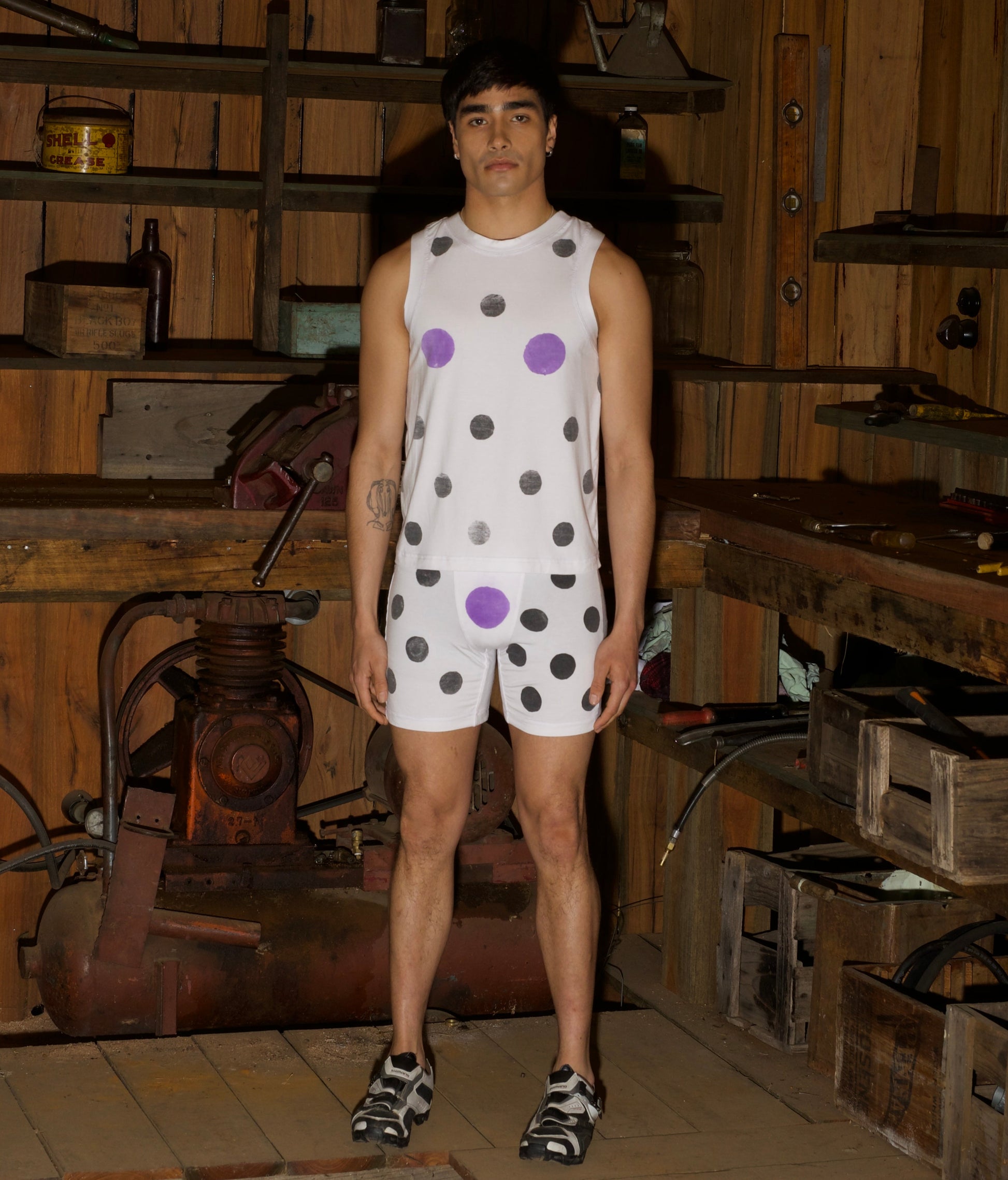 The Baby boxers are made in Melbourne as apart of the OLIVIA ROWAN X JOSAIA collaboration collection. The top is made from a stretch rayon fabric that is super light weight and comfortable for sleep or everyday wear. The garment is designed as a loungewear piece that can be worn in different occasions. Each garment is unique due to the hand painted dots on the fabric the paint is designed to look faded and worn with the integrity of the garment remaining